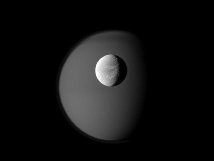 La superficie de la luna Dione de Saturno, surge en esta espectacular imagen, en primer plano, representando detalles nítidos de su estructura superficial. Justo detrás, aparece la mayor luna de Saturno, Titán, con una gran bruma que la envuelve, contrastando con la imagen nítida de Dione. En la fotografía se pueden observar también bandas atmosféricas alrededor del polo norte de Titán.